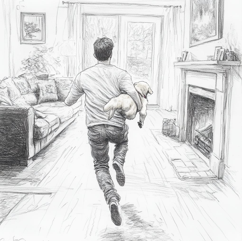 Lunging out of my chair, I scoop him up under my right armpit like a football and bank a right out of the door of my office. The backdoor to the yard isn't far, just 10 strides away through the living room. I'm going to make it, he's not throwing up in the house this time.