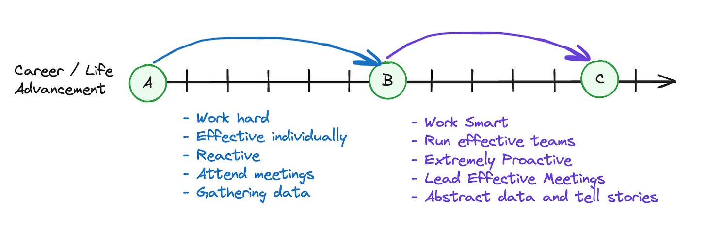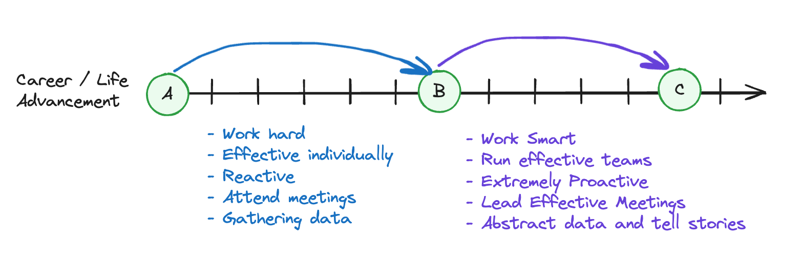 To get from A to B, attending meetings and playing my role was enough. To get to C, leading an effective meeting makes all the difference.
